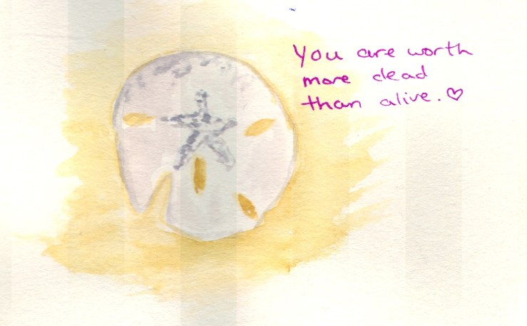sand dollars are beautiful dead pets, if you’re into that sort of thing Posted on March 1, 2011September 3, 2011 by Caroline Hobbs sand dollar I’d love to mount you on my wall. Share this: Click to share on Facebook (Opens in new window) Facebook Click to share on Reddit (Opens in new window) Reddit Like Loading... Related