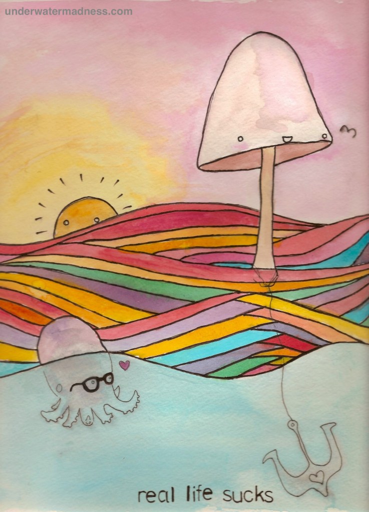 Adulthood blows. You have to make all of your own appointments, buy enough groceries (but not too much), and obtain your own hallucinogenic drugs. In fact, adulthood makes you take so many drugs you end up painting rainbow sunsets and sleeping for 20 hours. You think you’re a hipster octopus in love with a happy mushroom, but the shroom’s only interested in flirting with the birds, and that would be awesome, but it’s not real.